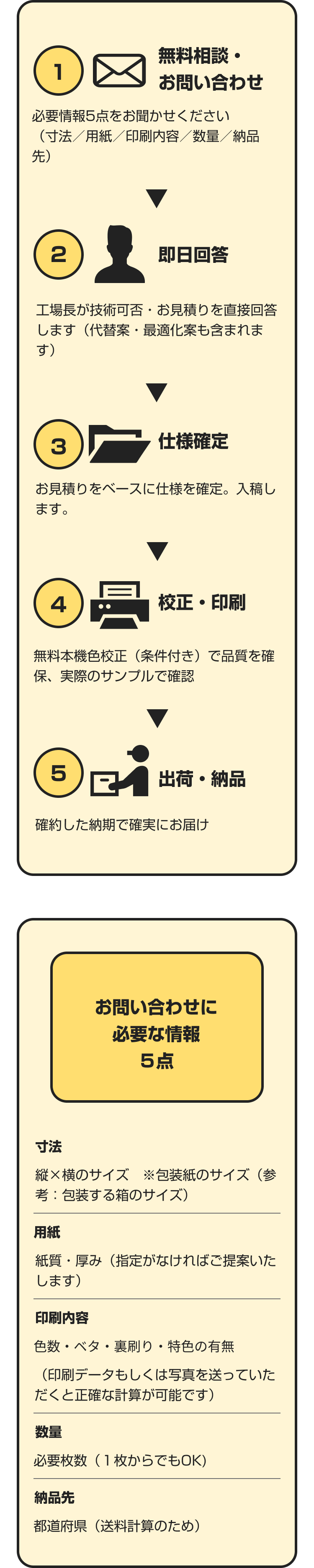 注文確定段階で色校正から納品までのおおよその納期が計算されますので、その納期内であれば問題ないと思いますが、お客様の指定された納期が当社計算と合わない場合は、希望納期の延長、もしくは注文をお断りさせて頂くことになります。